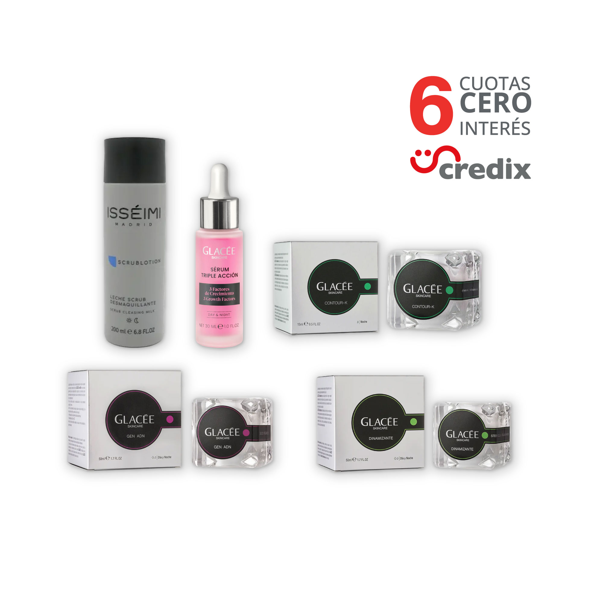 Transformá la firmeza, textura y vitalidad de tu piel con una rutina diseñada para atacar los signos visibles del envejecimiento desde diferentes frentes: renovación, regeneración y protección. Esta combinación trabaja de forma progresiva para suavizar arrugas, mejorar elasticidad y revelar un rostro más terso, luminoso y uniforme. Ideal para quienes buscan resultados reales y una apariencia rejuvenecida día a día.