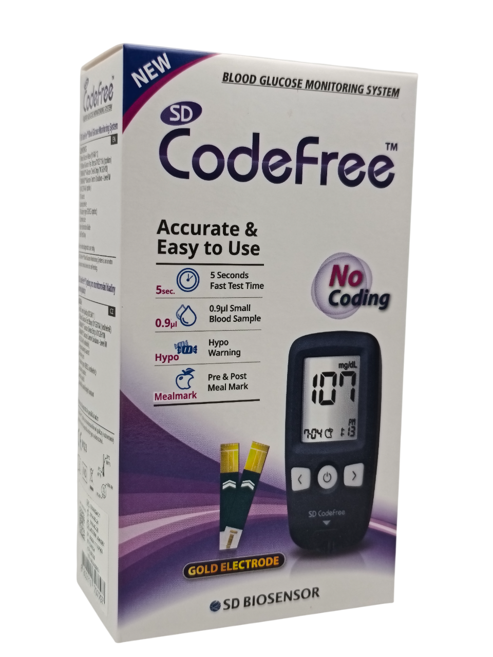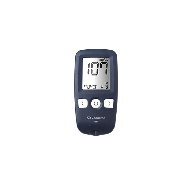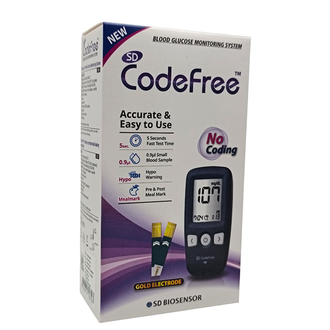 El SD CodeFree™ es un sistema de monitoreo de glucosa en sangre diseñado para un uso sencillo y confiable, tanto en el hogar como en entornos clínicos. Utiliza tiras reactivas SD CodeFree™ y una avanzada tecnología de biosensor para proporcionar resultados precisos en solo 5 segundos con una muestra mínima de 0,9 µL de sangre capilar.
