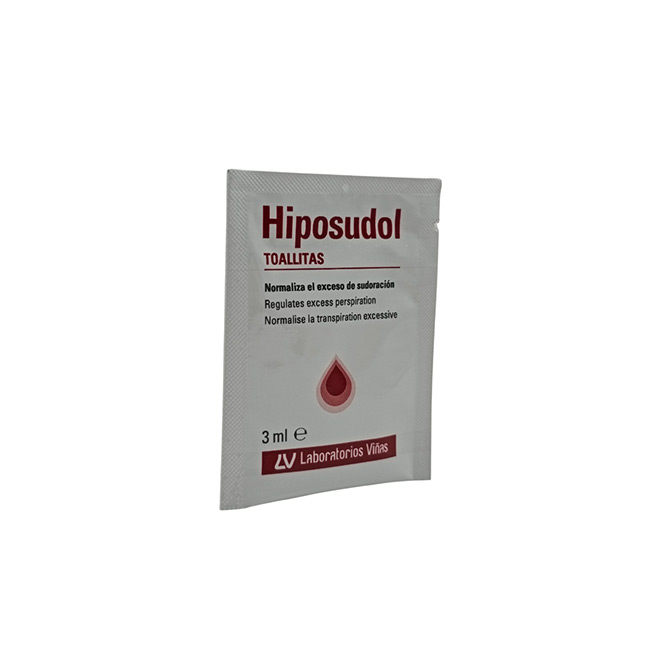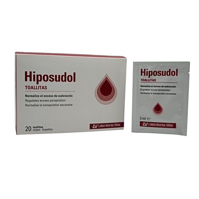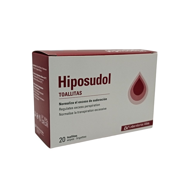 Hiposudol® Toallitas está formulado para el tratamiento de la hiperhidrosis (sudoración excesiva) en axilas, manos y pies. Contiene cloruro de aluminio hexahidrato al 20%, que actúa bloqueando temporalmente los poros de las glándulas sudoríparas para reducir la producción de sudor de forma segura y efectiva.