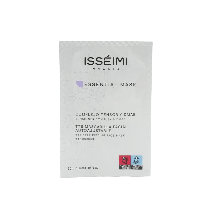 Mascarilla facial reafirmante es una máscara de biocelulosa con la forma de la cara y autoajustable (sistema de fijación en orejas y cuello, que permite fijarla a la cara permitiendo libertad de movimientos). Contiene activos tensores (Chemitol), DMAE, Elastina, Aloe Vera y Péptidos lo que la hace un producto ideal para reafirmar la piel y combatir la laxitud del tejido.